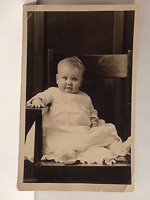 `ANTIQUE REAL PHOTO POSTCARD~ CUTE & ADORABLE BABY~WHITE DRESS~WOOD CHAIR~