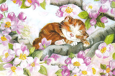 RARE Cat sleeping blooming apple tree by Panasenko Russian modern postcard