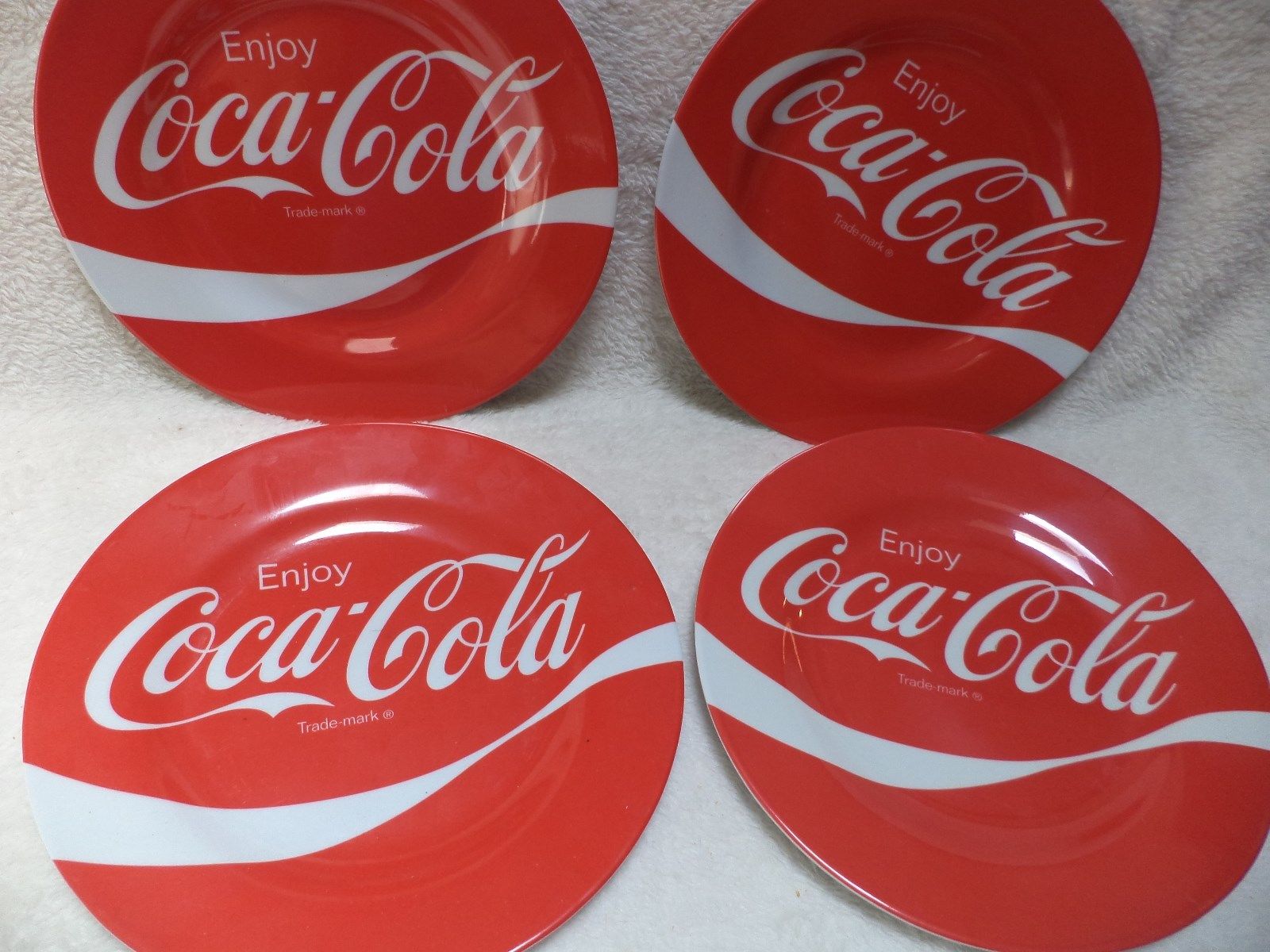 Title (ebay affiliate link): Enjoy Coca Cola Red white Plates 7 3/4 inches across set of 4 Picnic plates