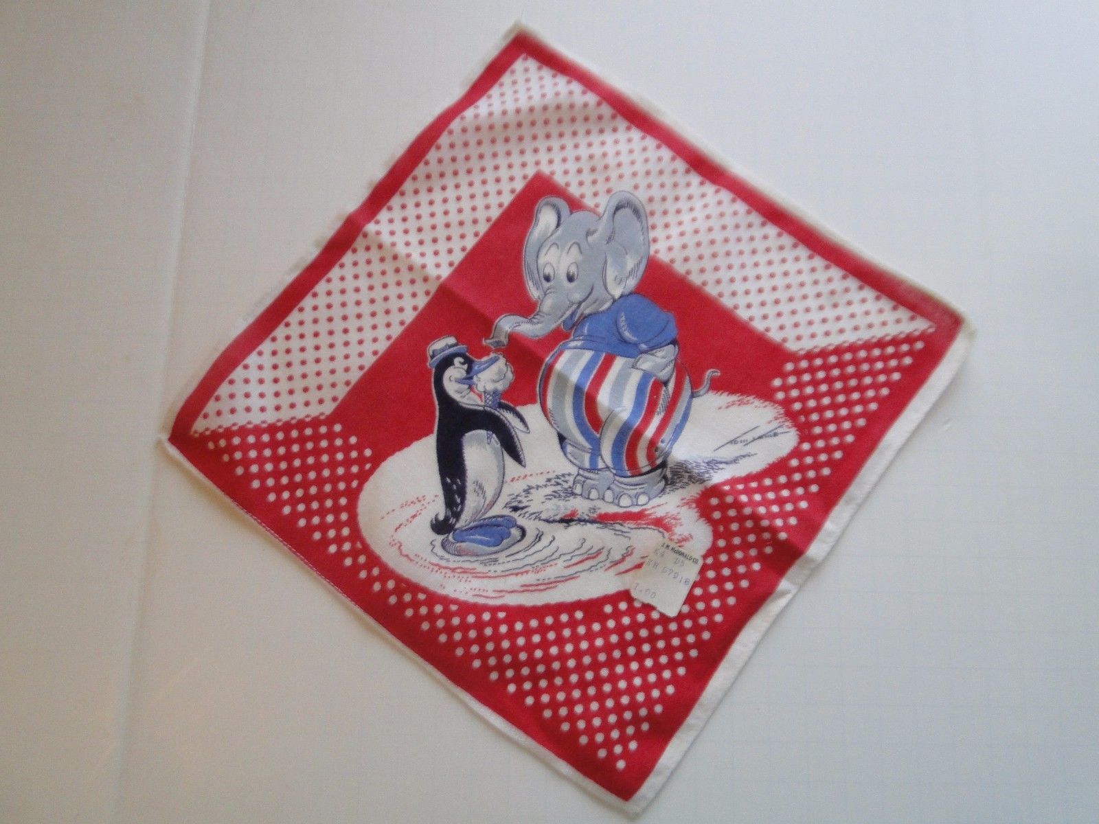 Title (ebay affiliate link): Vintage Child's Patriotic Elephant & Penguin Handkerchief Hanky Red White Blue