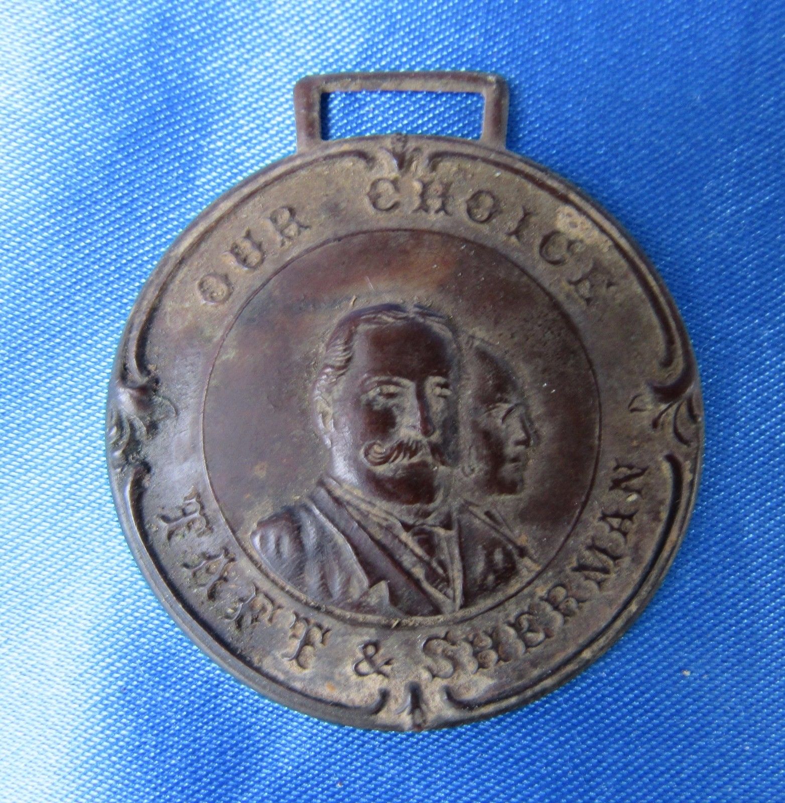 Title (ebay affiliate link): Brass TAFT & SHERMAN Our Choice JUGATE Watch Fob Campaign Button
