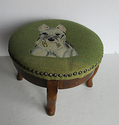 Vintage Needlepoint Foot Rest Stool Ottoman Antique Wood Green Dog Wooden