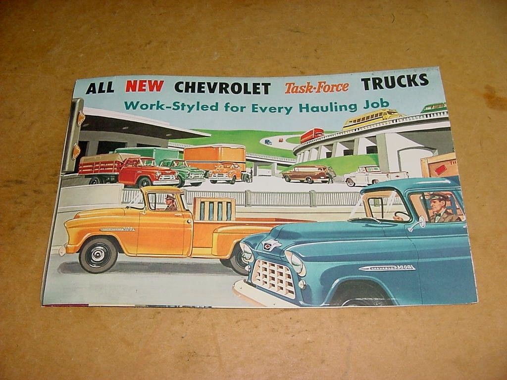 Title (ebay affiliate link): RARE NEAR MINT 1955 Vintage CHEVY TASK FORCE TRUCKS Old Color Dealer Brochure.