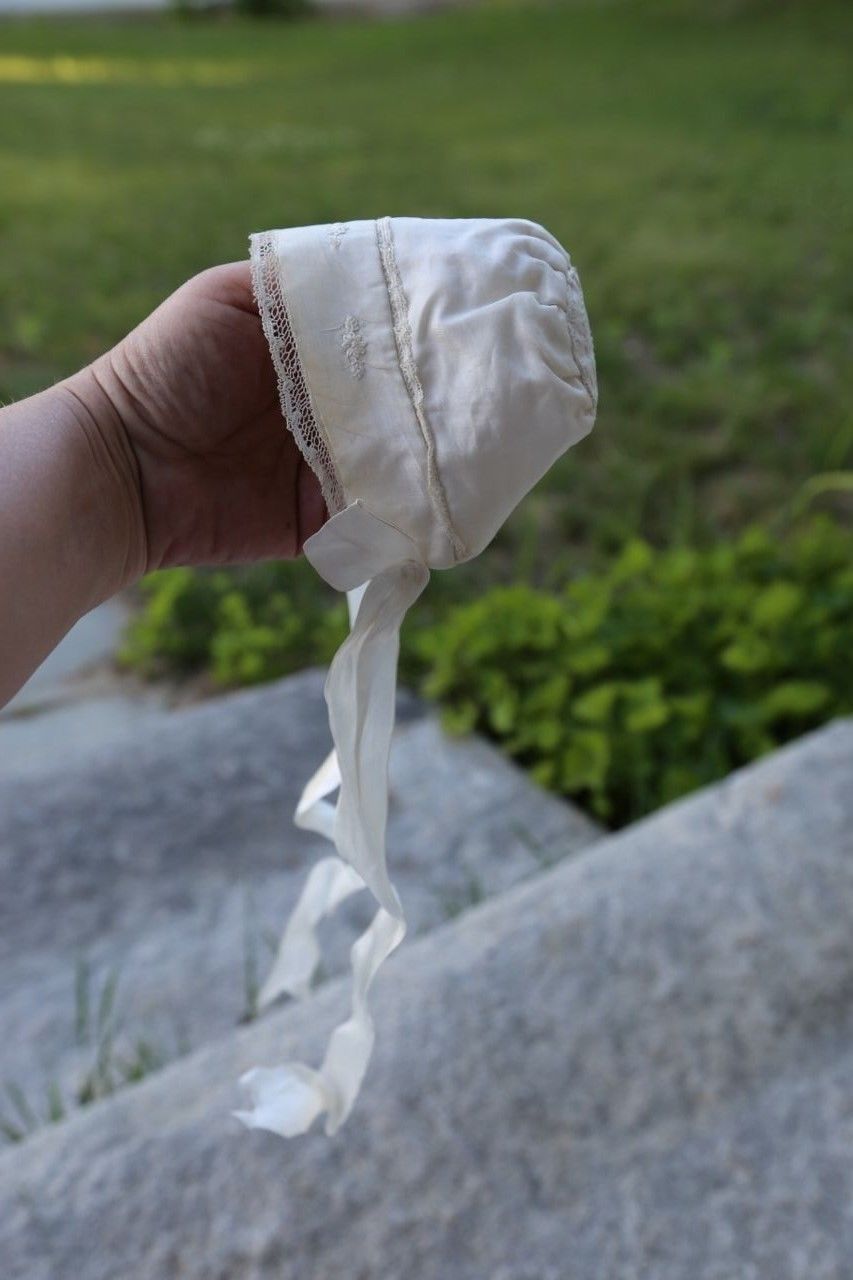 Title (ebay affiliate link): Lovely Antique Dainty Ivory SILK DOLL BONNET Wide Silk Ties LACE Embroidery