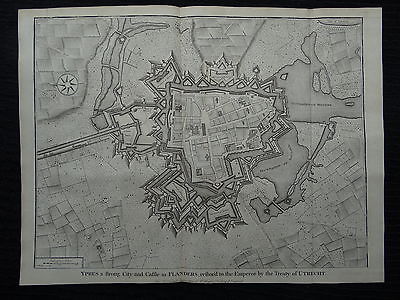 1744 RAPIN / TINDAL Atlas View of YPRES - Flanders Belgium - Map plan