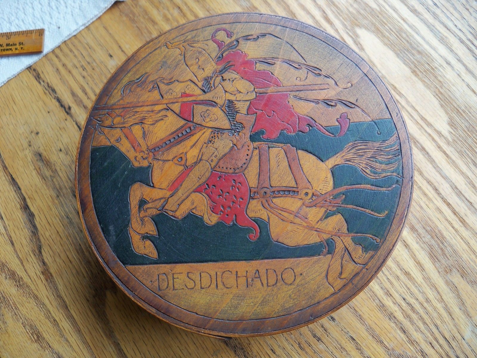 Title (ebay affiliate link): SMALL ROUND WOODEN PANTRY BOX IN OLD PAINT FOLK ART ANTIQUE Lions Knight wood