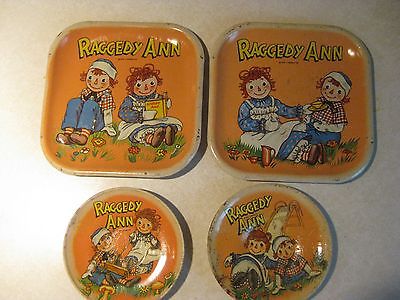 vintage 1959 raggedy ann tin toy dishes, j. gruelle co-2 plates, 2 saucers.