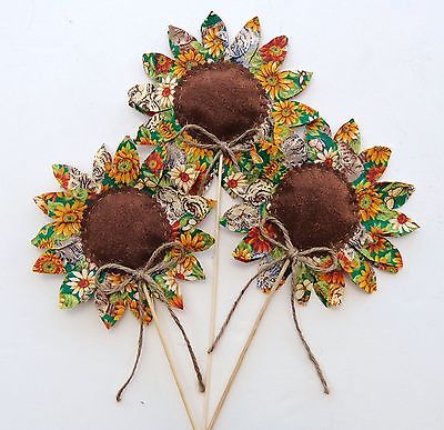 Title (ebay affiliate link): (3) NEW HANDMADE YELLOW BROWN FABRIC SUNFLOWER ORNIES --by lavender-n-aqua
