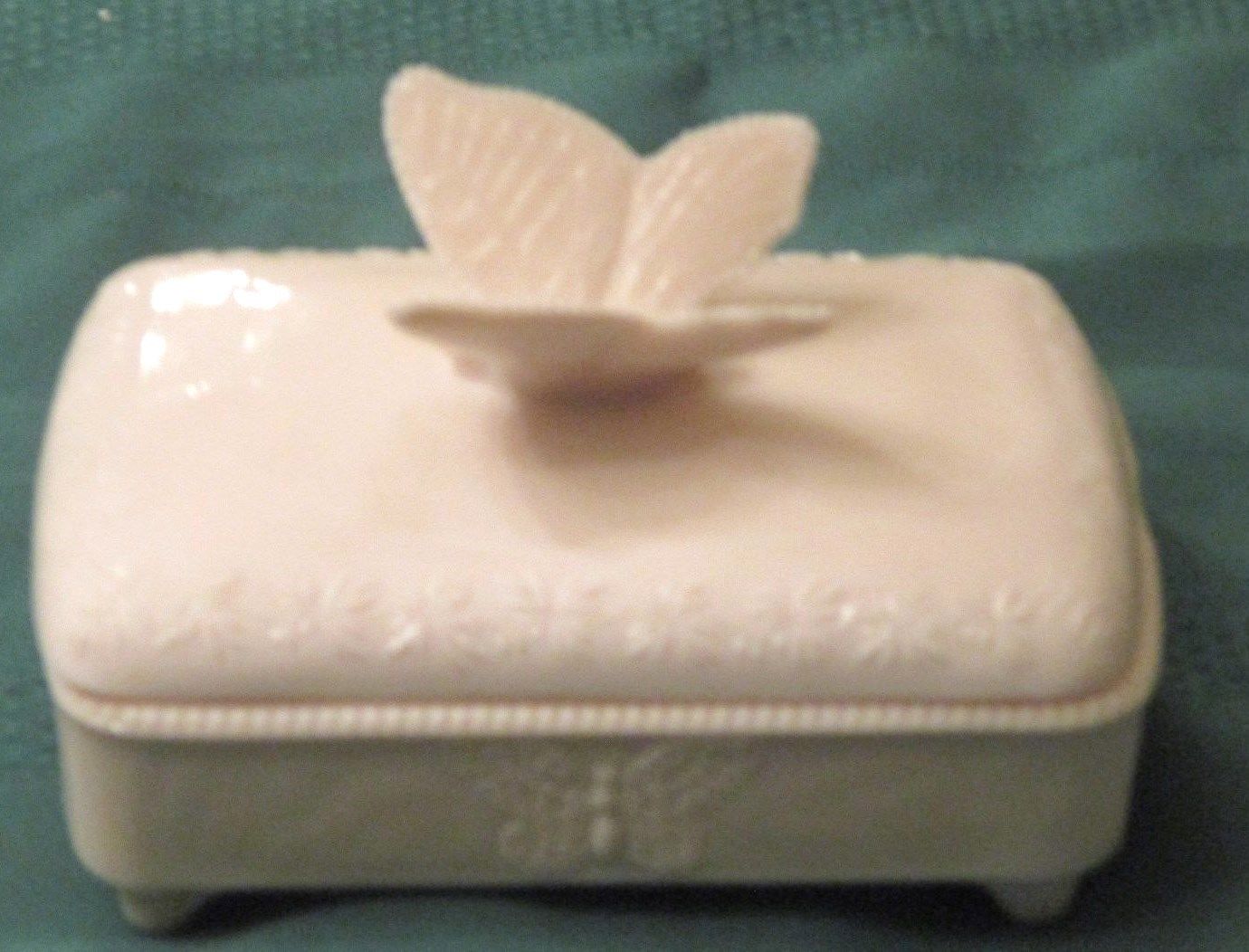 Title (ebay affiliate link): VINTAGE JEANETTE GLASS PINK MILK GLASS BUTTERFLY CIGARETTE DISH & LID