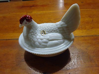 Westmoreland Milk Glass Hand Painted Red Comb Hen On Nest Pattern Covered Dish