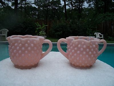 RARE VINTAGE 1950'S FENTON PINK OPALESCENT MILK GLASS HOBNAIL SUGAR & CREAMER