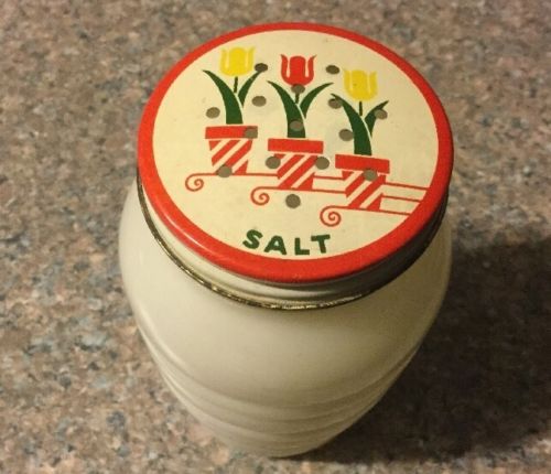 Title (ebay affiliate link): Vintage Milk Glass Metal Lid Salt Shaker Fire King Anchor Hocking Retro