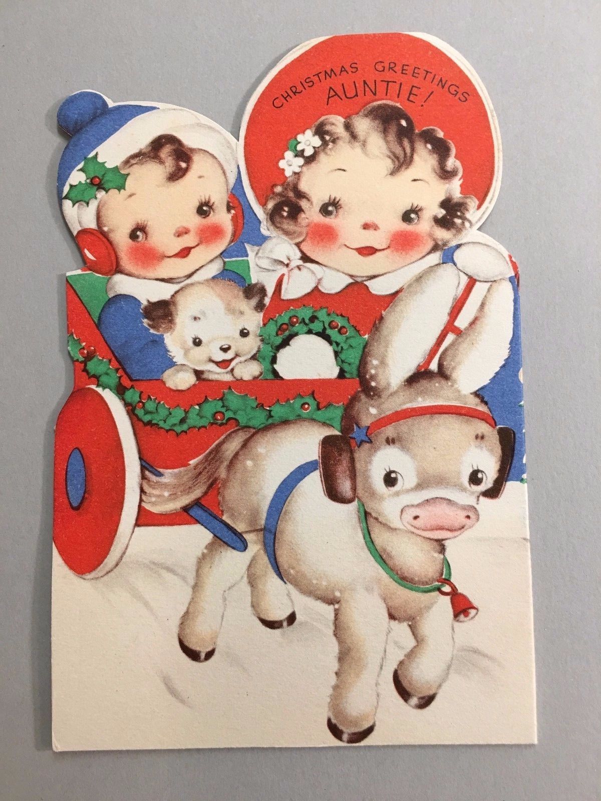 Title (ebay affiliate link): Vintage Christmas Greeting Card 1944 Donkey Children Tri-Fold Rust Craft Die Cut