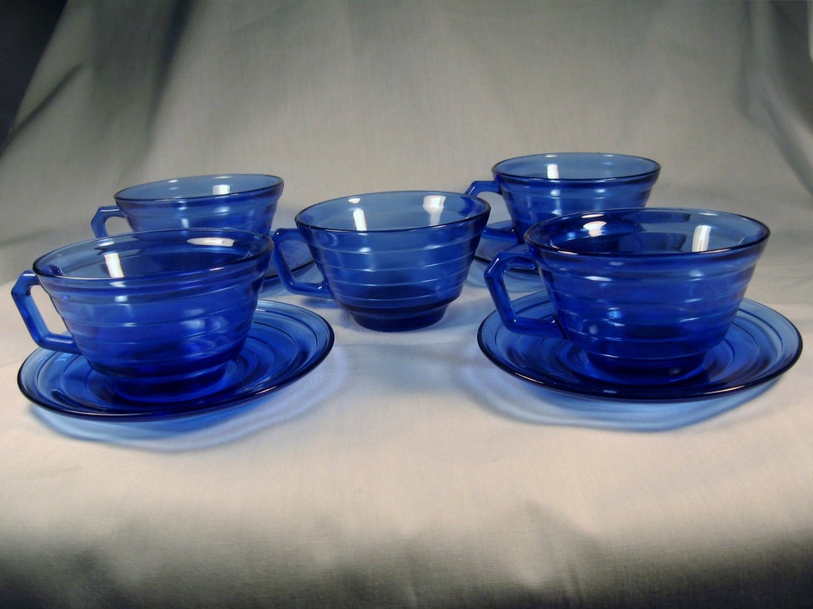 Title (ebay affiliate link): VTG 30's/40's Depression Glass Hazel Atlas Moderntone cobalt 5 cups 4 saucers
