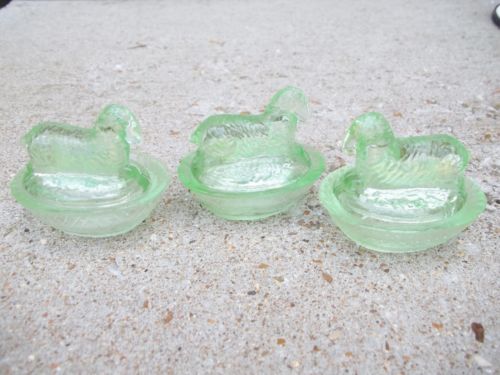 Title (ebay affiliate link): 3 GREEN DEPRESSION GLASS MINI MINIATURE SHEEP LAMB ON NEST OPEN SALT DIP!