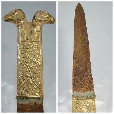 Title (ebay affiliate link): Medieval Old Gold Gild Silver Bronze Dagger knife With 2 Heads