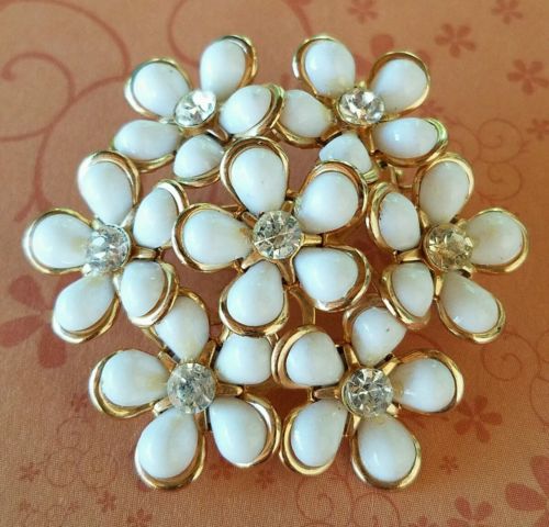 Title (ebay affiliate link): VINTAGE ESTATE RETRO Faux? Milk Glass And Crystal Rhinestone Floral Brooch Pin