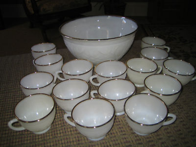 MILKGLASS SET - PUNCH BOWL WITH 16 CUPS - GOLD RIM