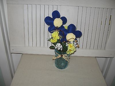 Handmade Primitive Shelf Sitter Blue Daisies/Daisy Flowers In Blue Mason Jar