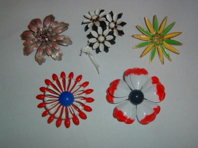 VTG FLOWER POWER ENAMEL BROOCH LOT RHINESTONE MILKGLASS