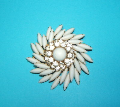 Vintage Judy Lee White Milk Glass & Rhinestone Brooch