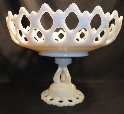 LARGE LACE EDGE MILK GLASS COMPOTE BASKET