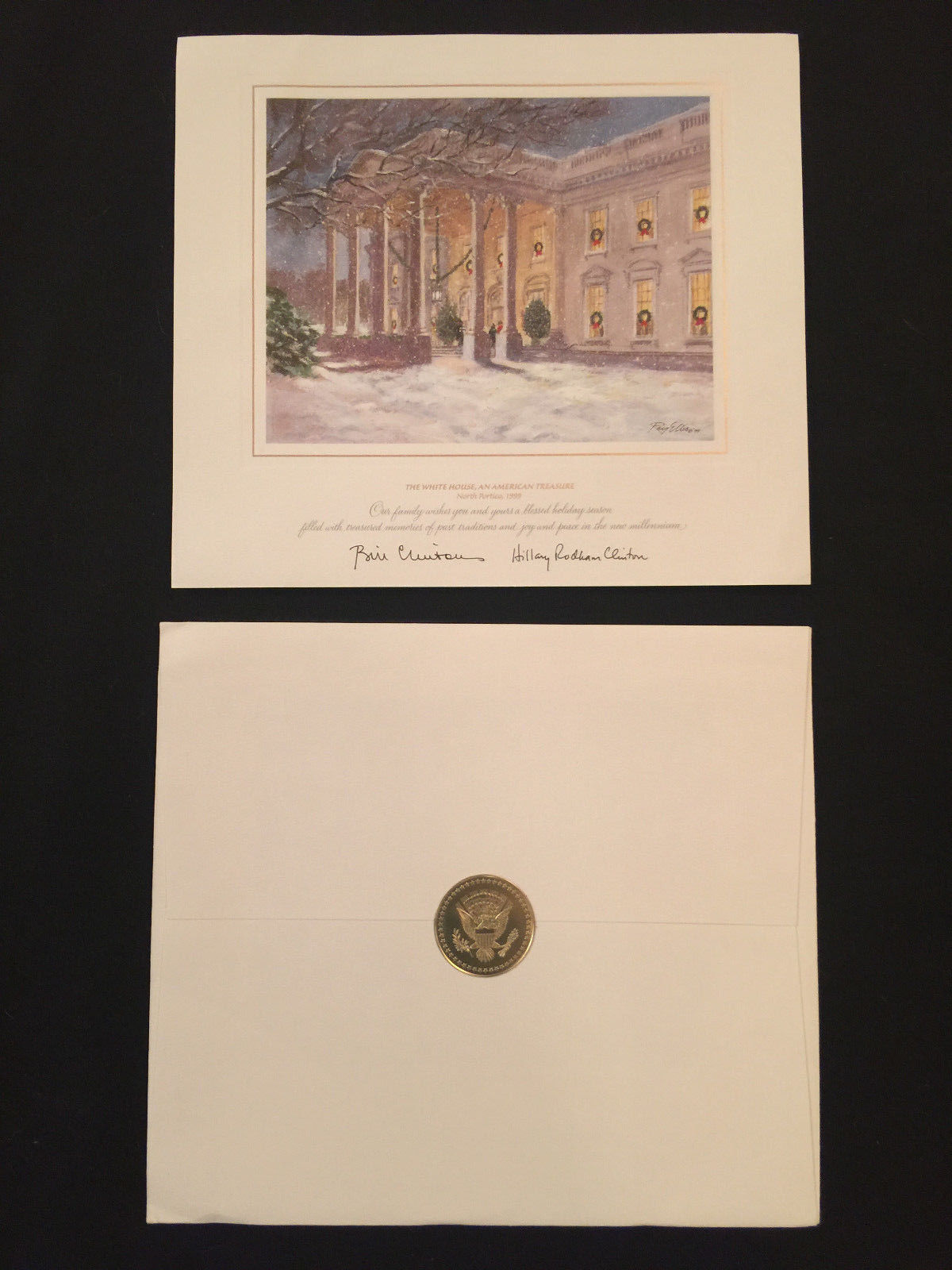 Title (ebay affiliate link): LARGE HILLARY AND BILL CLINTON 1999 WHITE HOUSE CHRISTMAS CARD W/ENV. 12 X 13.5