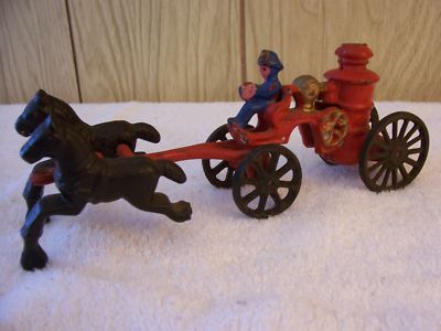 VINTAGE CAST IRON FIRE WAGON PULLED BY TWO HORSES NICE