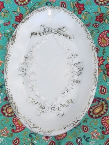 Title (ebay affiliate link): EAPG Antique Milk Glass ROSES & BOWS Oval Plate Platter c1900's Dresser Tray