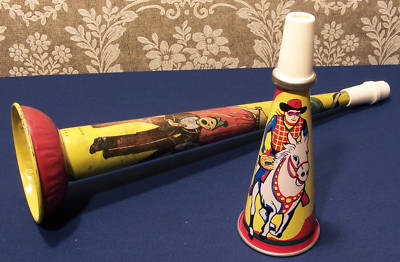 2 Vintage Tin Litho Toy Horns Noisemakers USA & Japan