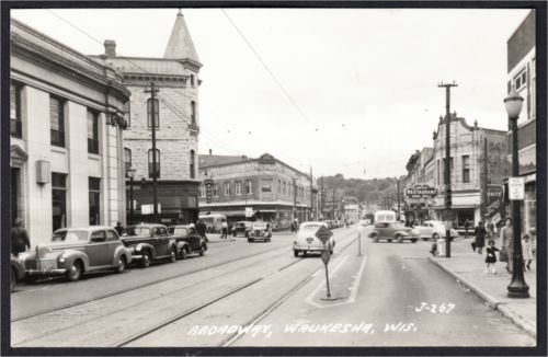 Waukesha WI Broadway at Five Points Street Scene 1940s Cars Trolley Tracks RPPC