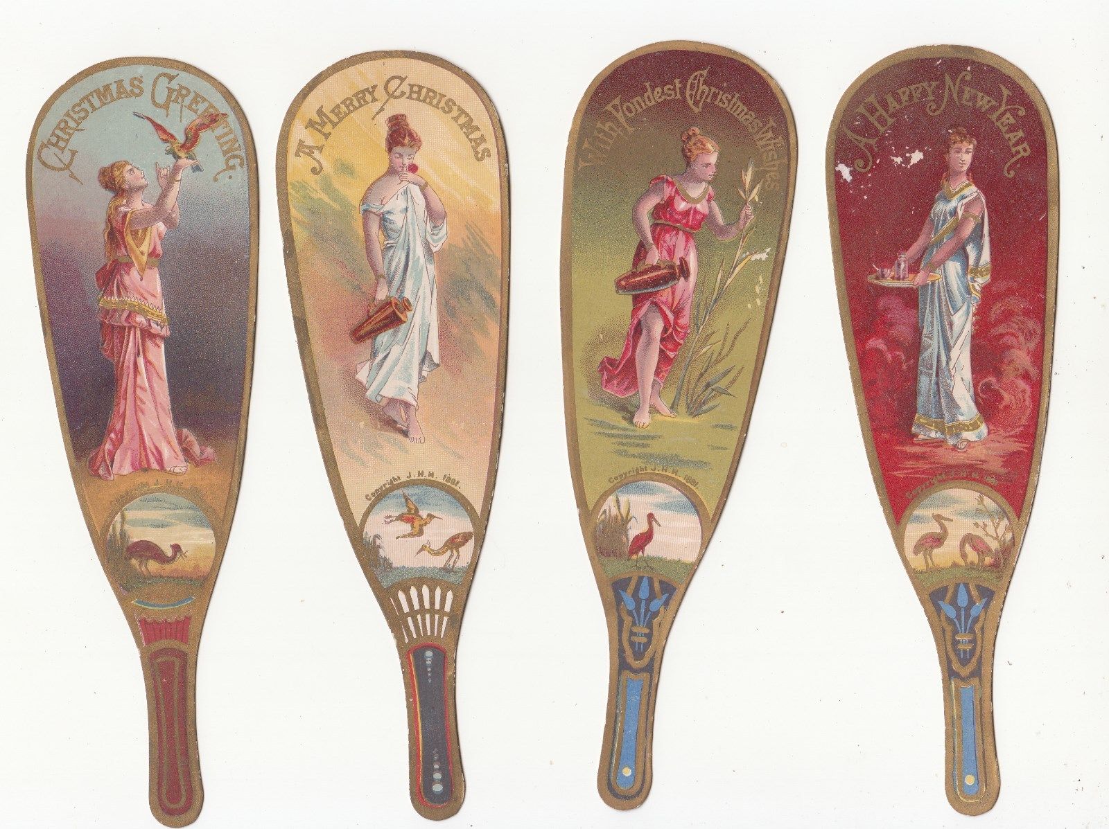 Title (ebay affiliate link): 4 Wanamaker & Brown Christmas New Year Fans Diecut Oak Hall Card c 1880s