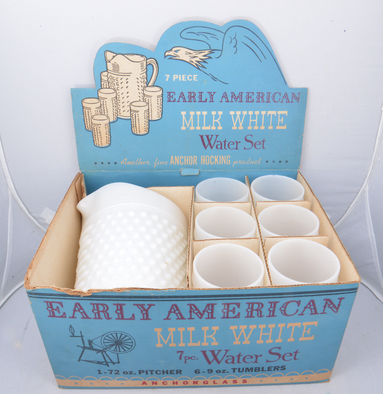 Title (ebay affiliate link): VINTAGE ANCHOR HOCKING HOBNAIL WHITE MILK GLASS PITCHER & 6 GLASS