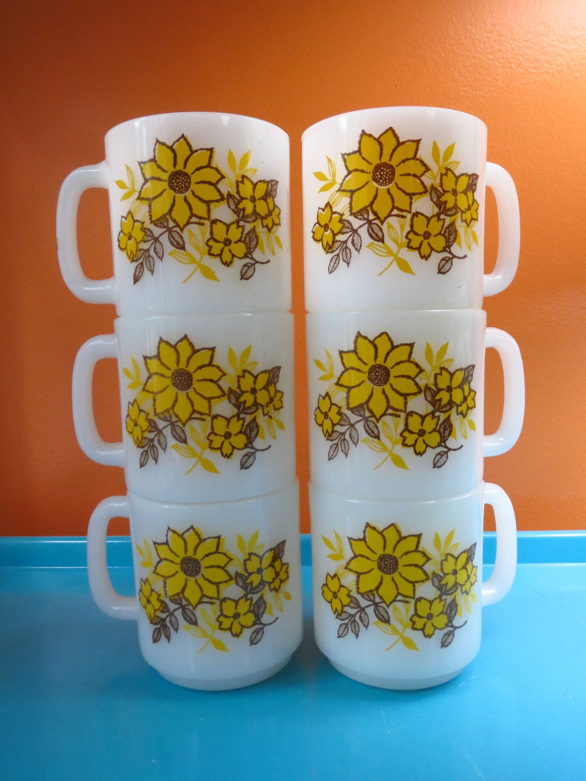 Title (ebay affiliate link): VTG 1970s Retro Yellow Flower Power Milk Glass Glasbake Coffee Cups Mugs LOT 6ct