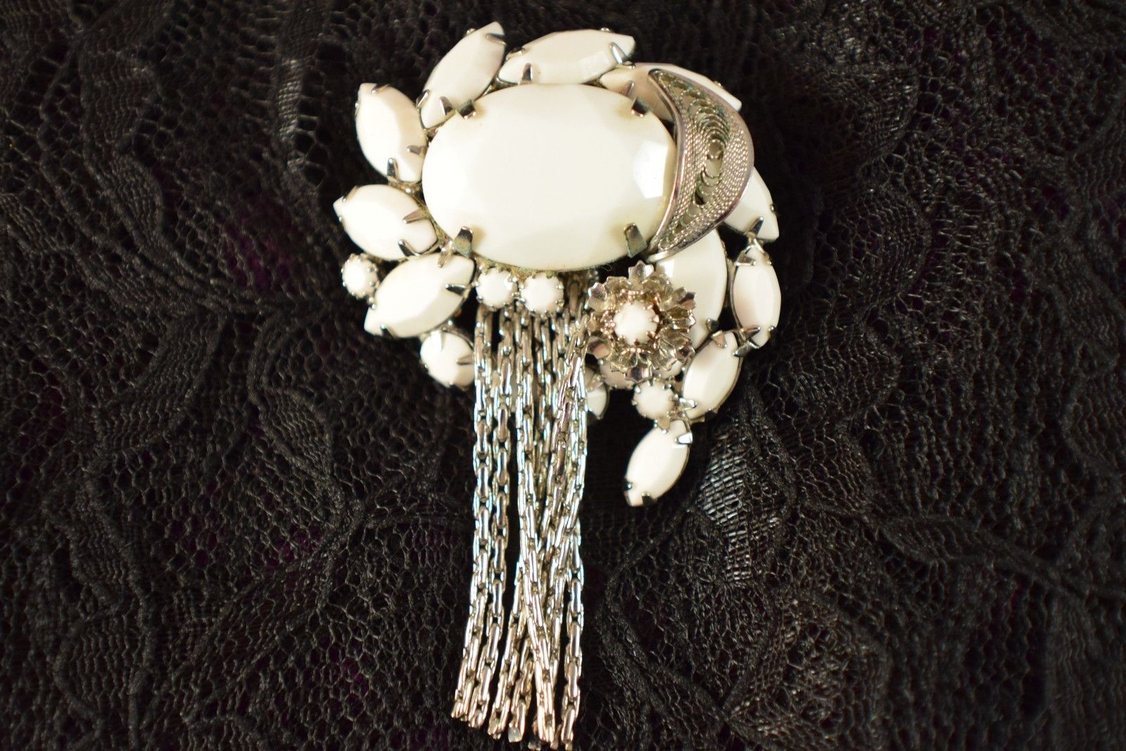 Title (ebay affiliate link): VINTAGE ESTATE MILK GLASS CABOCHON &NAVETTES SILVER TONE DANGLES BROOCH LOT #214
