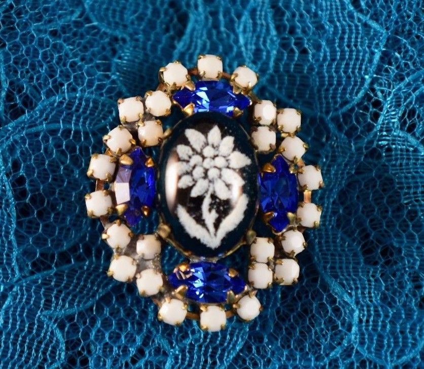 Title (ebay affiliate link): ANTIQUE BIJOUX MG MONTANA BLUE FLOWER CAB&RHINESTONE MILK GLASS BROOCH LOT# 217