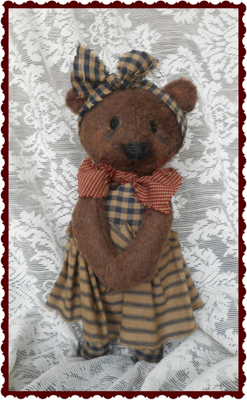 Primitive Handmade*~`Prissy the `Teddy Bear Doll* Standing*Homespun Dress`OOAK