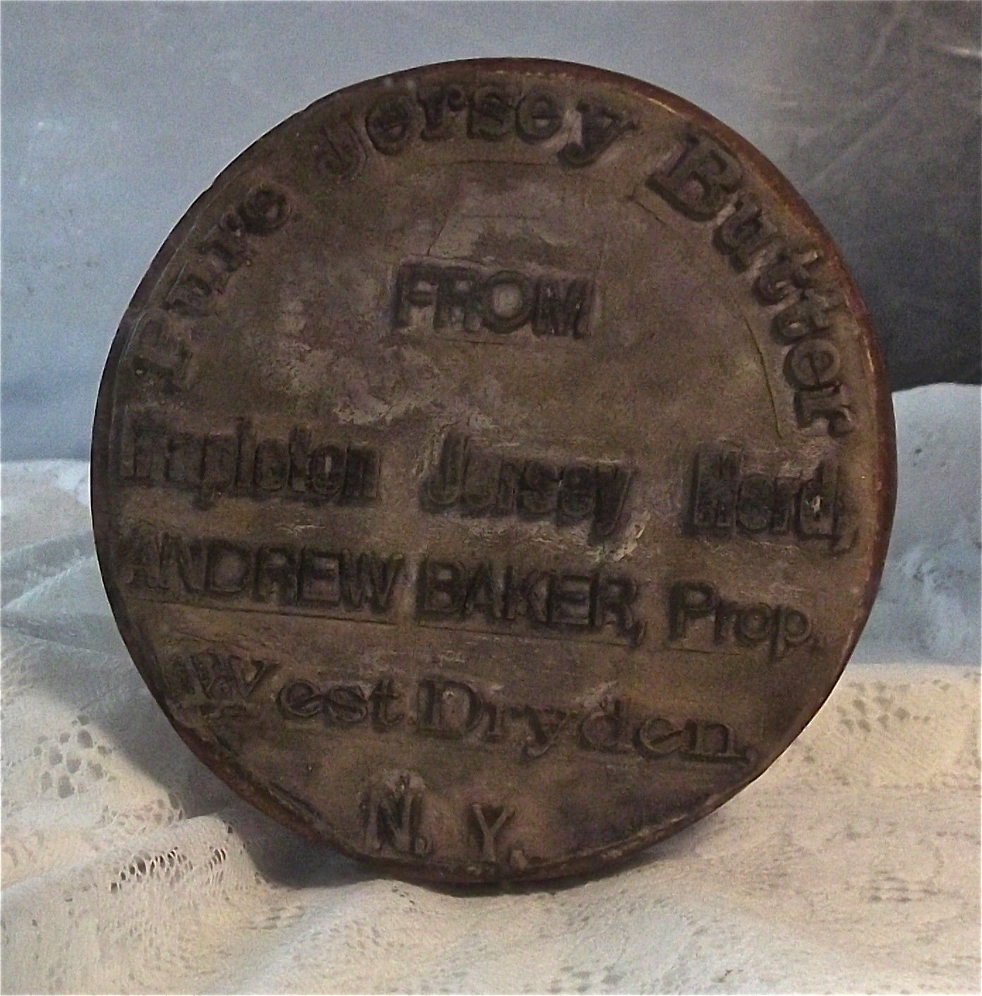 Title (ebay affiliate link): Old Dryden Dairy Farm Fresh Jersey Butter Press, Andrew Baker Prop.
