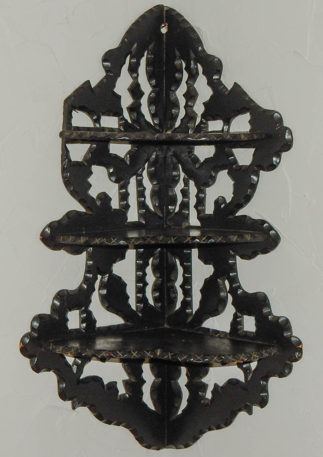 Title (ebay affiliate link): Antique Ornate Chip Carved Corner 3 Shelf Black Painted 29" Tramp Art