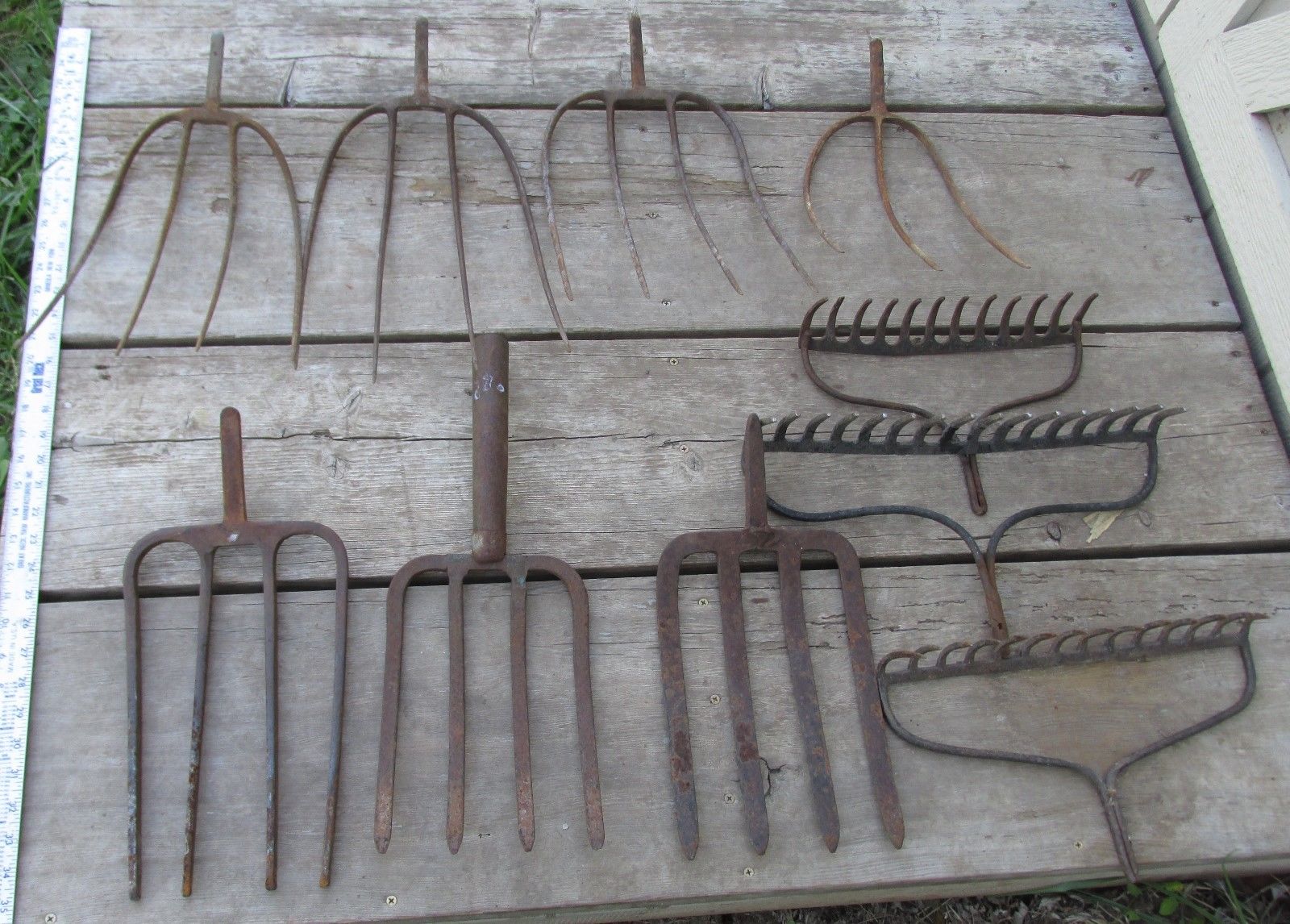 Title (ebay affiliate link): Lot of 4 Vintage Farm Pitch Forks 3 Potato Forks and 3 Rakes