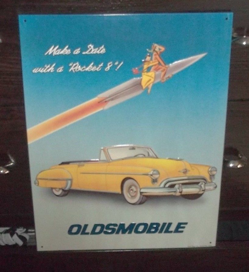 Title (ebay affiliate link): Oldsmobile Rocket 8 Vintage Embossed DIE CUT Metal Sign 12" X 16" NEW OLD STOCK
