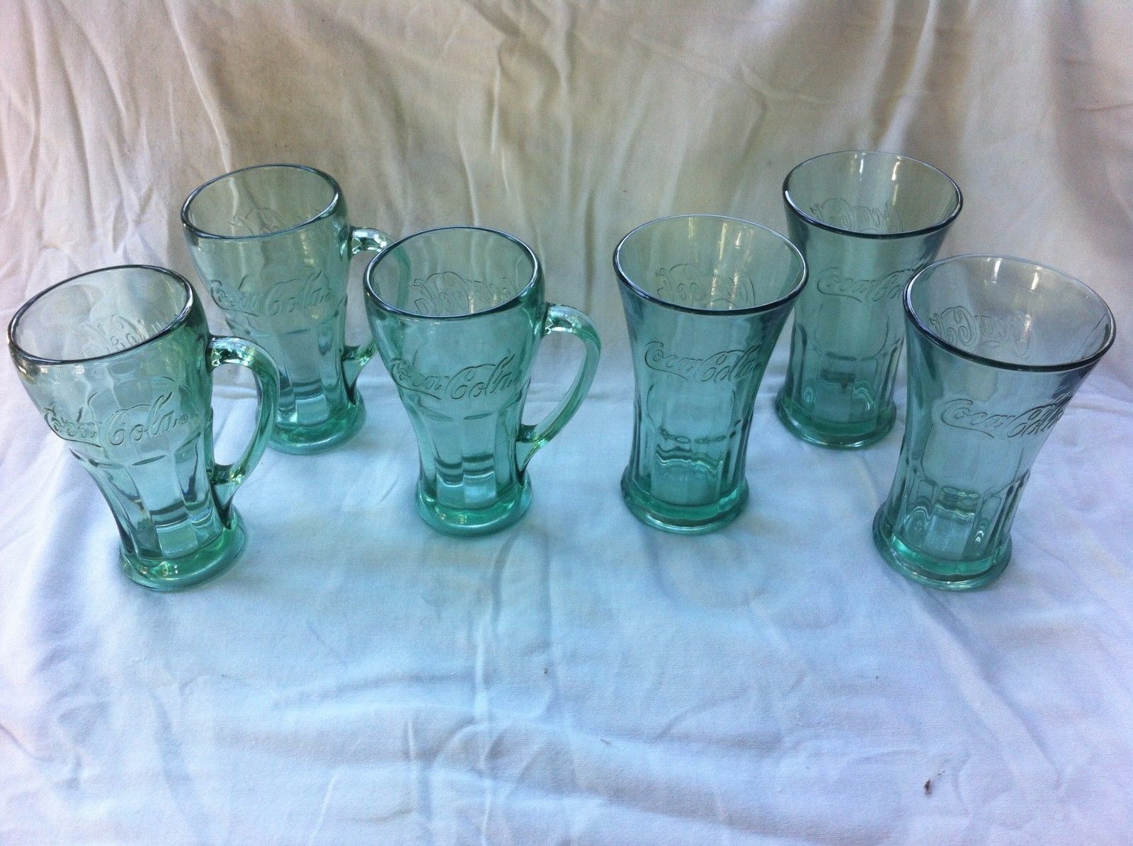 Title (ebay affiliate link): 3 Libbey Coca Cola Green Mugs W/Handels /3 Glasses Heavy Glass Embossed 16 oz