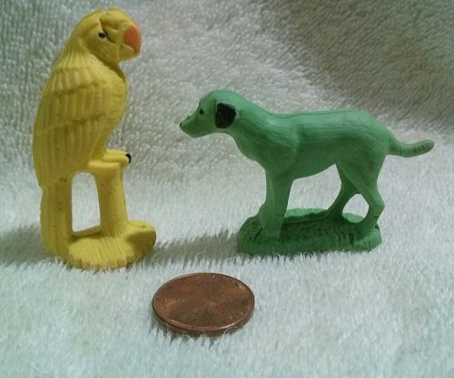 2-Vintage Diener Marked Rubber Erasers-Toy Figurines-GREEN DOG-YELLOW PARROT