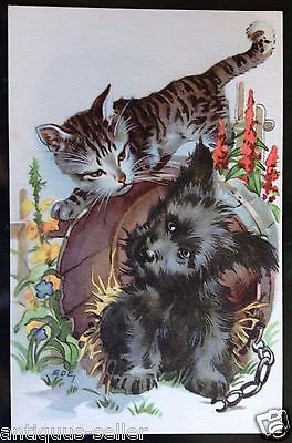 Scottish Terrier dog & cat kitten playing animal original old 1910s postcard