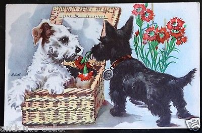 Scottish give flower Russell Terrier puppy dog animal original old 1910 postcard