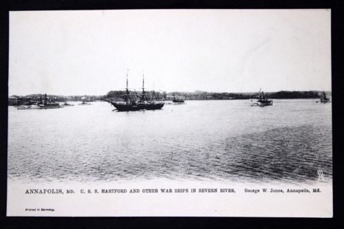 Title (ebay affiliate link): c.1905 Postcard U.S.S. Hartford & Other War Ships in Severn River, Annapolis, Md