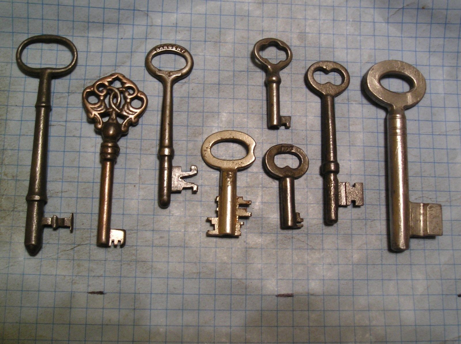 8 ANTIQUE OLD SKELETON, FURNITURE, BARREL, CABINET AND LOCK KEYS