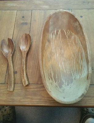 Title (ebay affiliate link): Primitive Wooden Trencher Wood Bread Bowl Very Worn with 2 Spoons