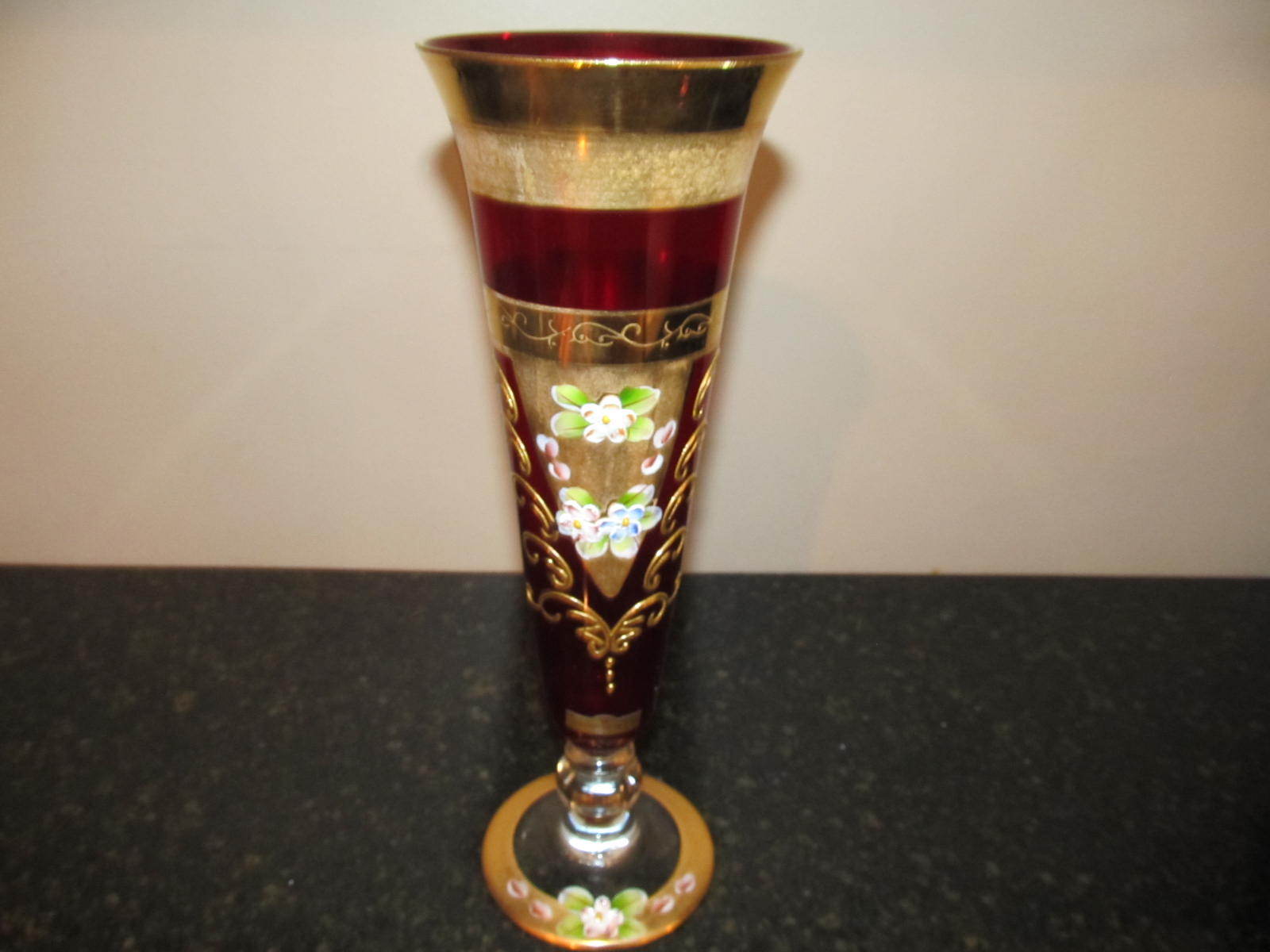 Title (ebay affiliate link): Victorian Blown Glass Blood Red w Gold Filigree & Flower Embellishments 10"