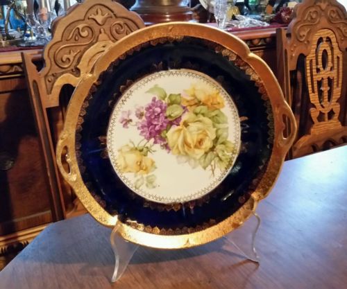 Vintage Handled Cake Plate Encrusted Gold & Cobalt Blue w/ Yellow Rose Center
